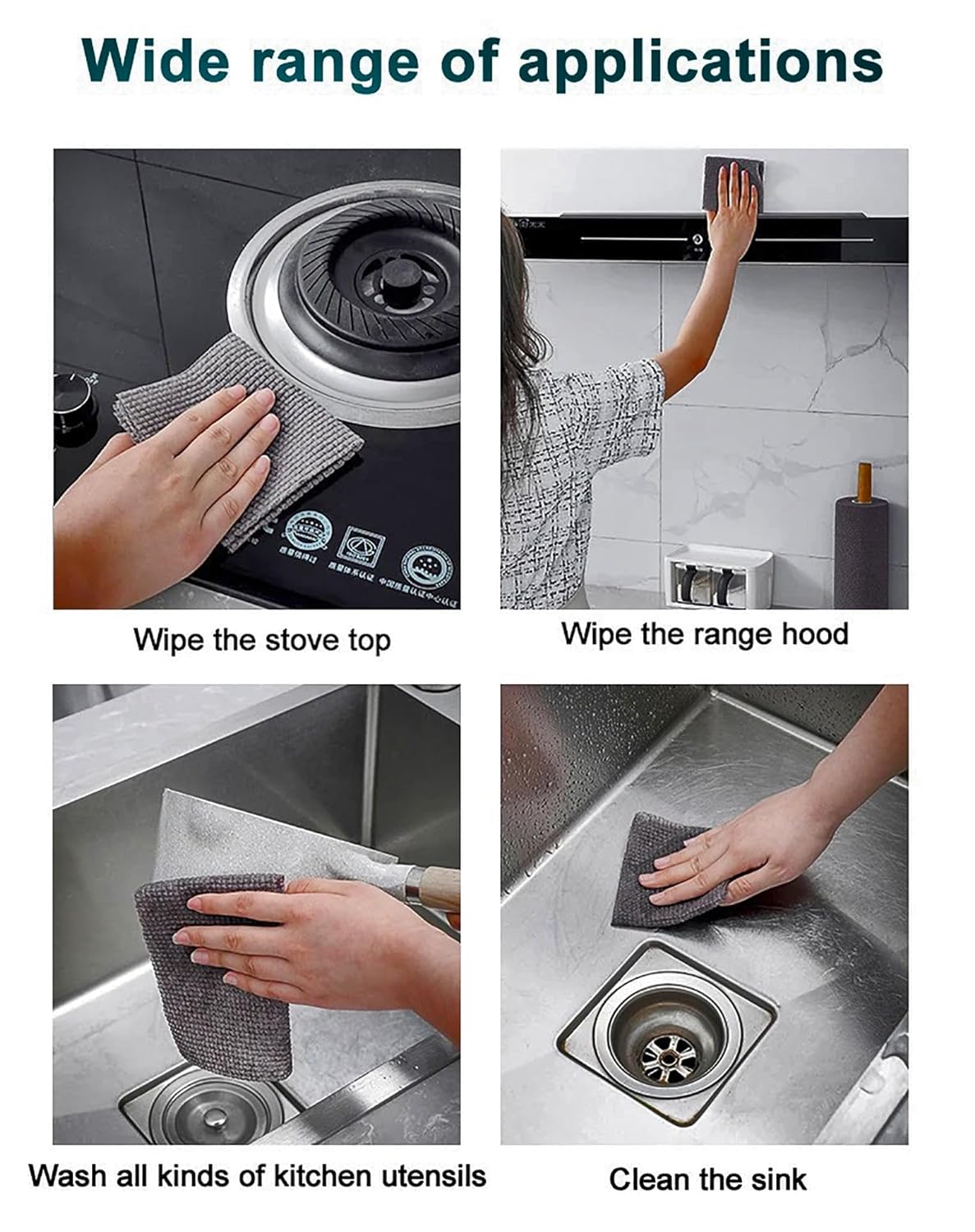 Our kitchen cloth is crafted from quality polyester and polyamide, offering superior softness and absorbency. It's non-abrasive, durable, and reusable, and can be used wet or dry without the need for extra cleaning solutions.